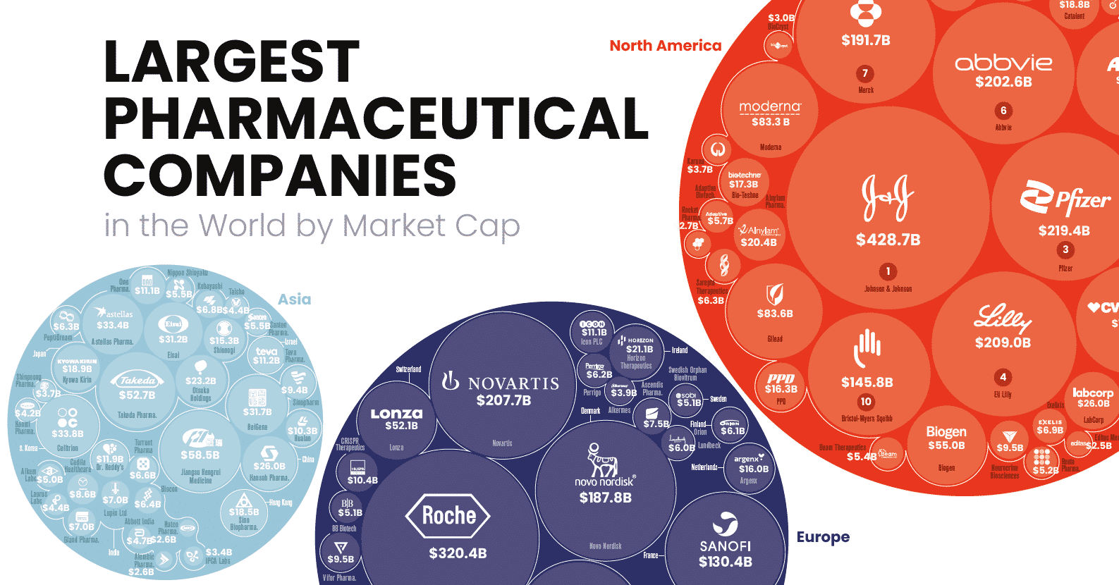 In the global rankings of the top 100 global pharma companies, 10 of the top 50 are headquartered or have a branch in the Basel Area. Online research analysts Visual Capitalists mapped out the world’s biggest pharmaceutical companies and plotted their value according to their 2020 market capitalization, as set out in the graphs below4.