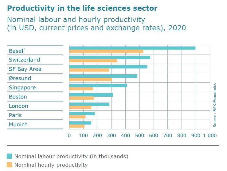 The region of Basel stands out in some aspects: no other life sciences hub in the world is growing as rapidly. The recorded growth is 9.3 percent per year in the period from 2010 to 2020. Regarding productivity, the Basel Area is steaming ahead of the international competition, and far ahead of other leading locations such as the San Francisco Bay Area, Øresund, Singapore, Boston, London, Paris and Munich. One more aspect: The universities in the Basel cluster perform well. They score 105 points on the BAK Higher Education Index, 5 percent above the average for regions in Western Europe and the United States. The quality of local research institutions is highly relevant to a region‘s ability to innovate.